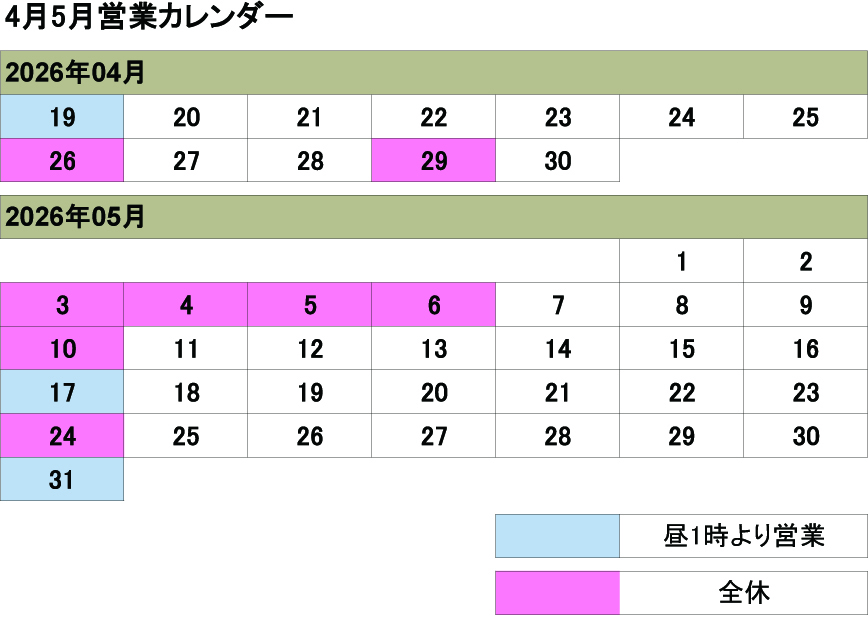 4月5月の営業カレンダー