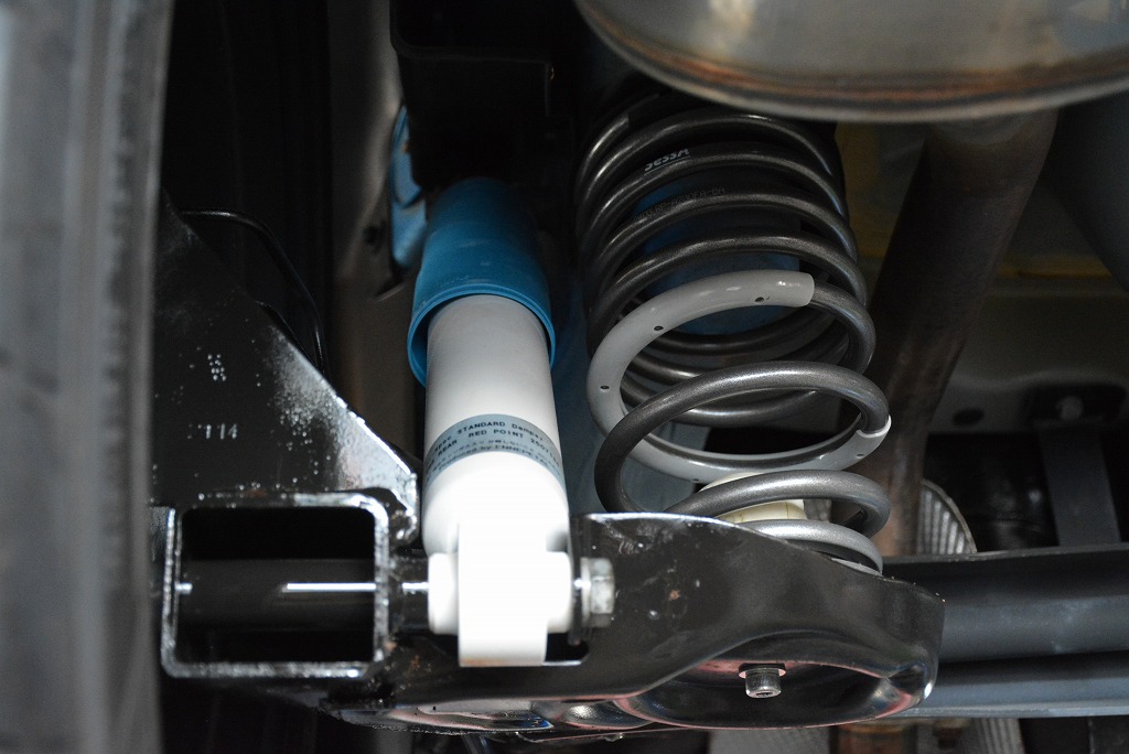 別メーカーのダウンサスが組み付けられており、随分と下がっていました。