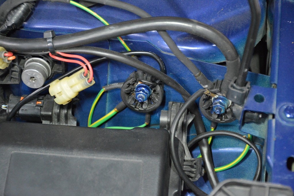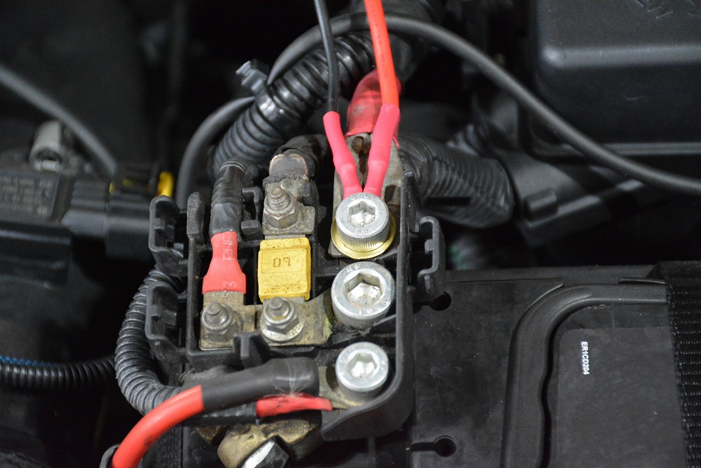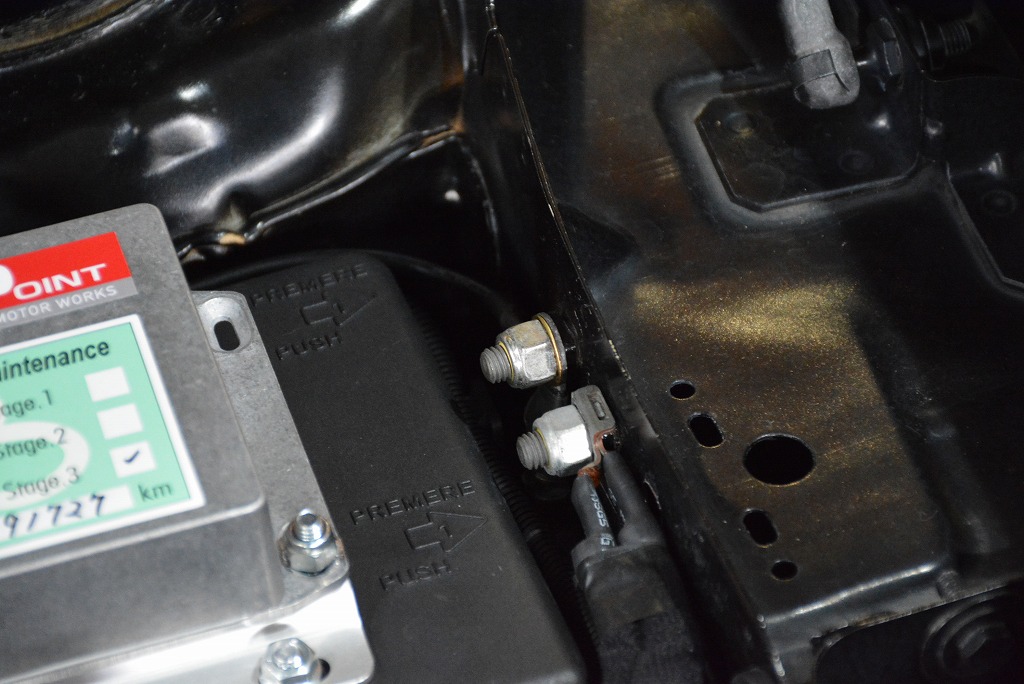 プラス側端子は、バッテリターミナル部へ結線し、アースはボディアースを使用しています。