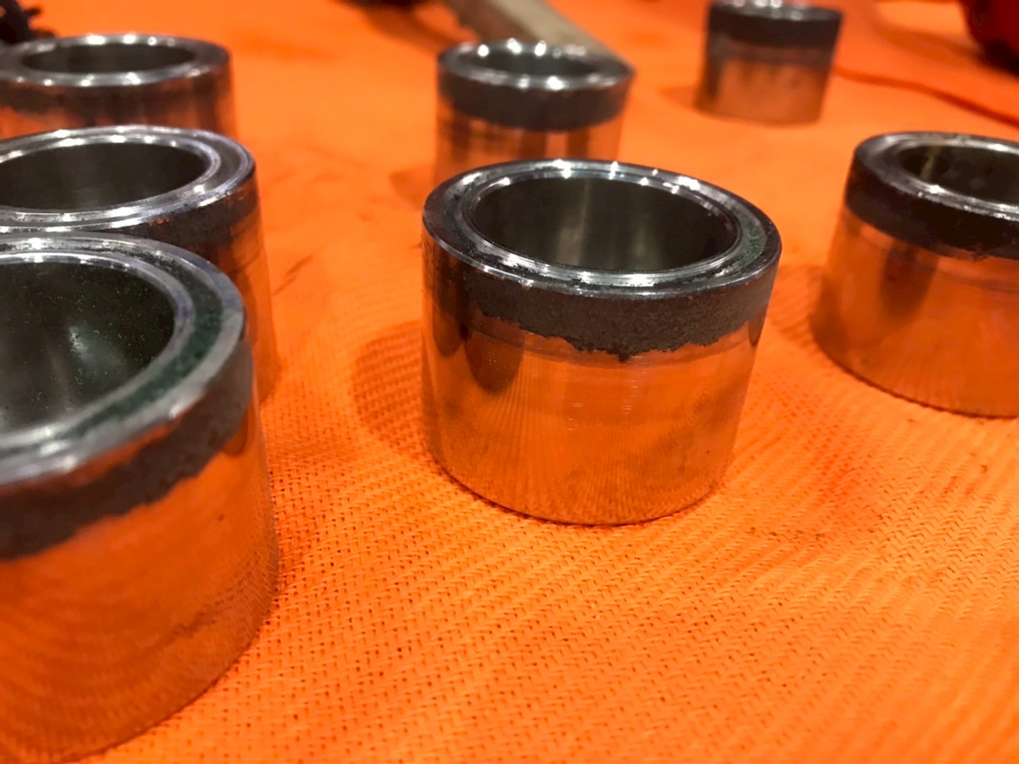 不安は的中!!ダストブーツを持たないレーシングキャリパーはキャリパーピストンが腐食による錆傷で再使用が出来ません。補修パーツが存在しないため、他社流用の加工などでキャリパーを再生します。無いモノは製作も行う作業となりました。