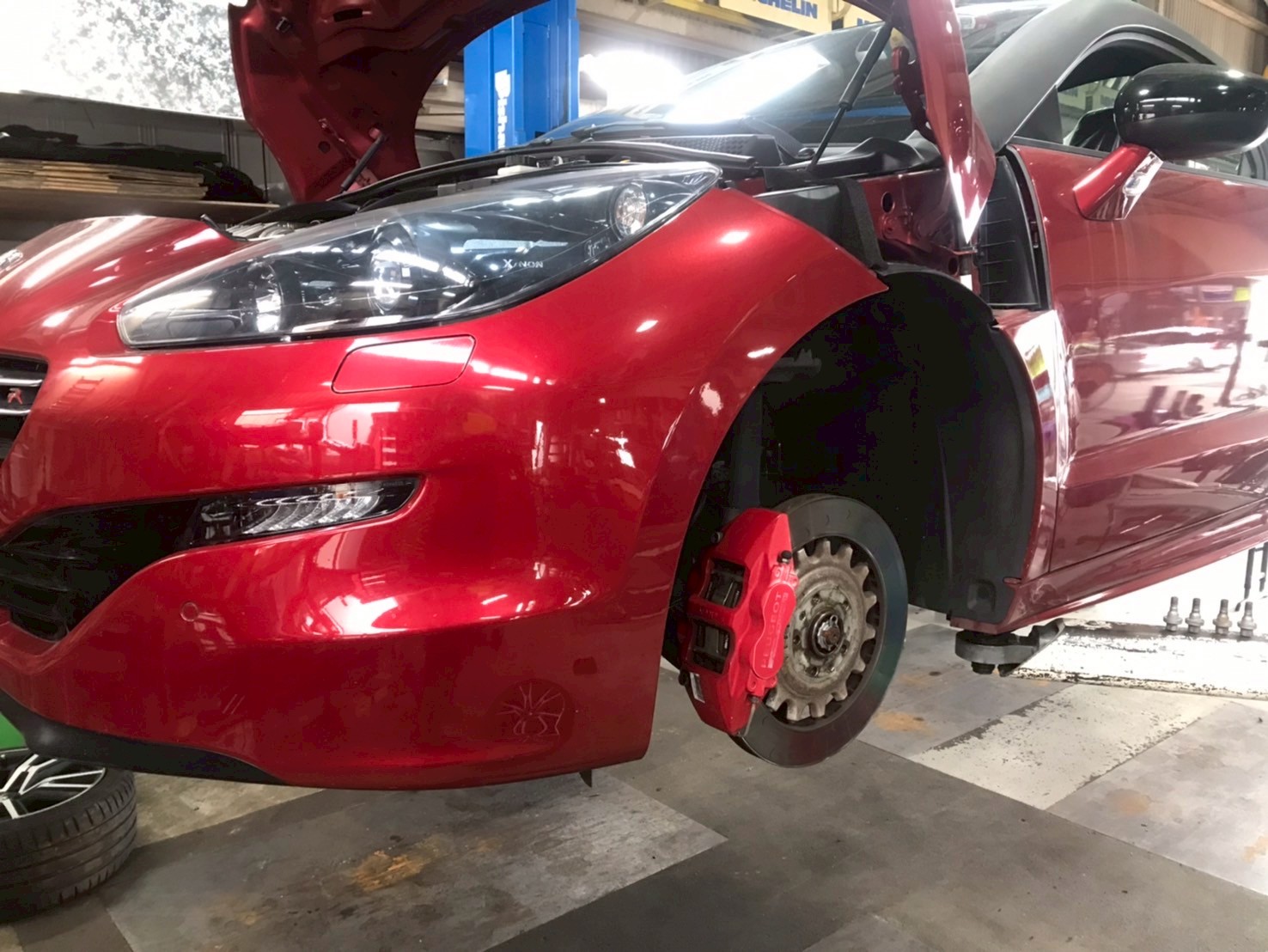 継続検査での入庫のRCZは高性能270PSエンジン搭載のRモデルとなります。以前よりユーザー様の意向でブレーキ廻りの整備を希望されており今回パッドとローターの交換を進めます。