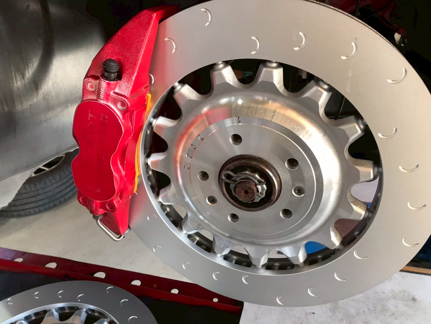 380㎜の大きなブレーキローターはRCZ Rとプジョー308GTIには形状の違いはありますが、使用されるブレーキキャリパーは同じの様です。本来ブレーキキャリパーアッセンブリー交換となりますが高額部品の為、出費を抑え作業をご提供させて頂けました。