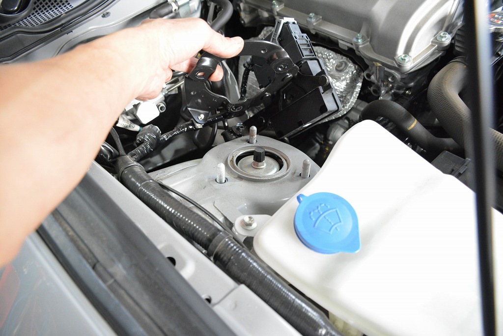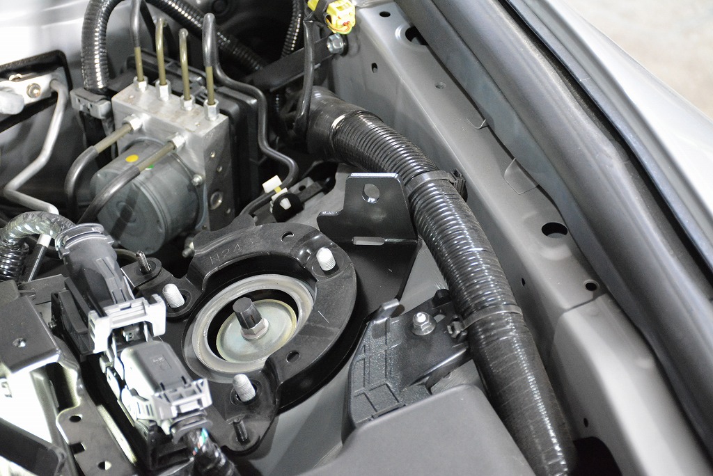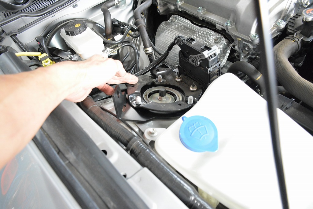 ストラットハウジングに固定されるブラケットプレートを取り外し、その下にMCBのブラケットをセットします。
