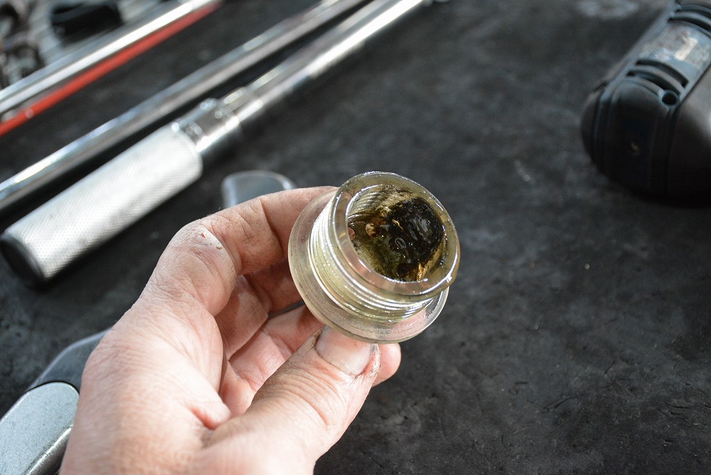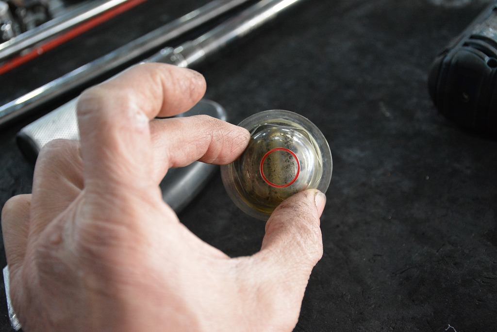 ドレンからオイルを抜き取って、オイル交換を遂行中。