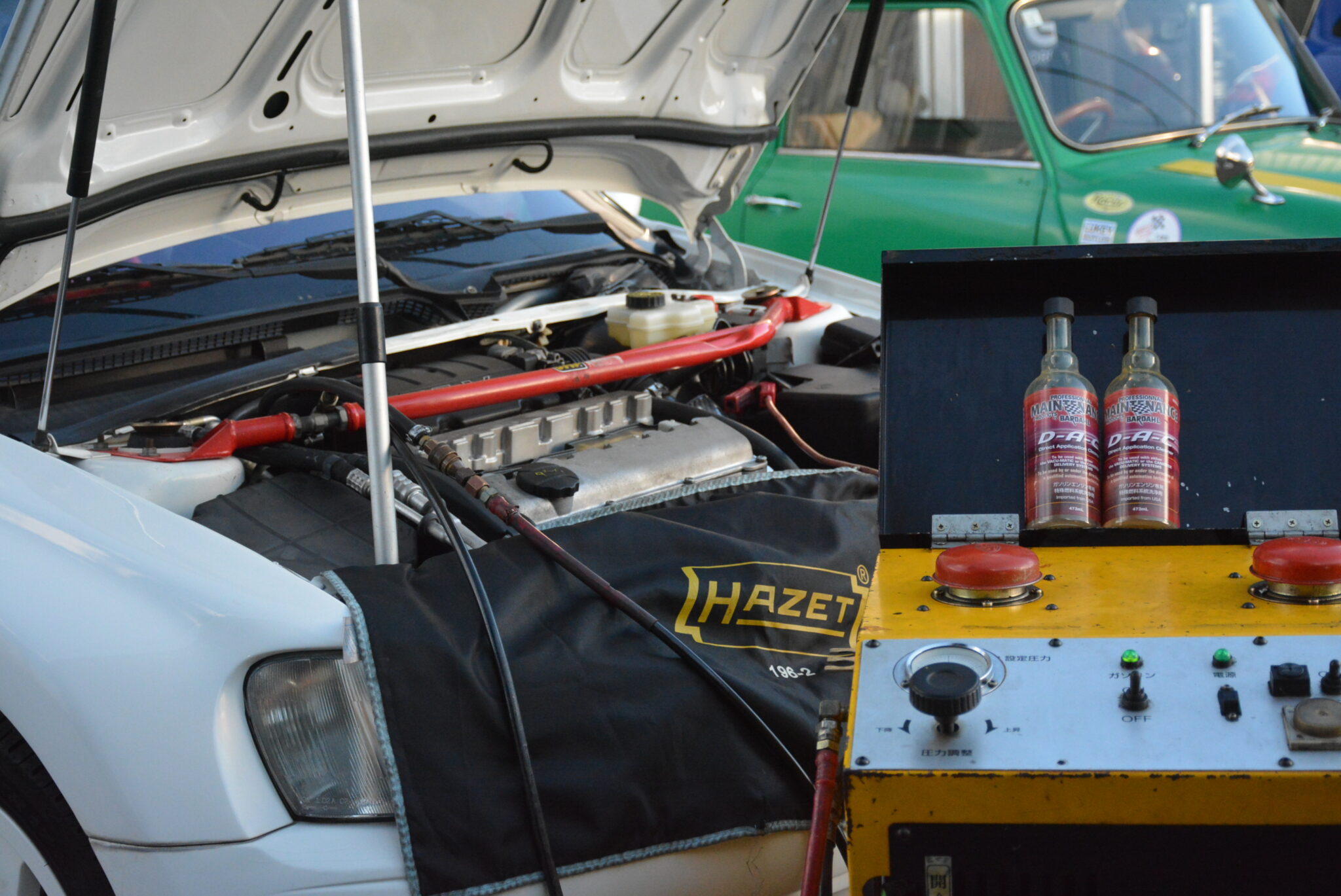 機械に専用液剤を入れ、エンジンを始動。アイドリングランを続け、燃焼室内のカーボンに液剤を浸透させ軟化促進をおこないます。