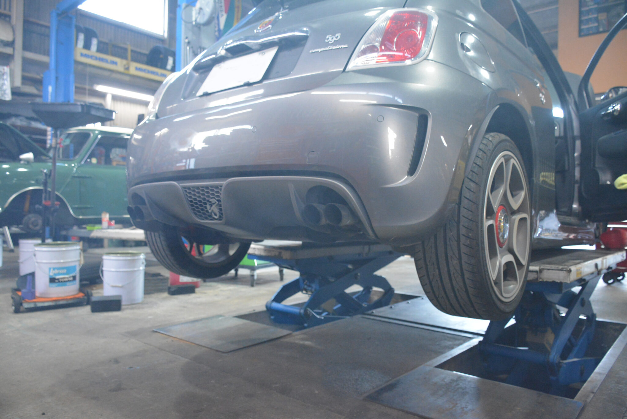排気管の出口からモクモクと煙が立ち上がる。困った症状を抱えたアバルトのご入庫です。