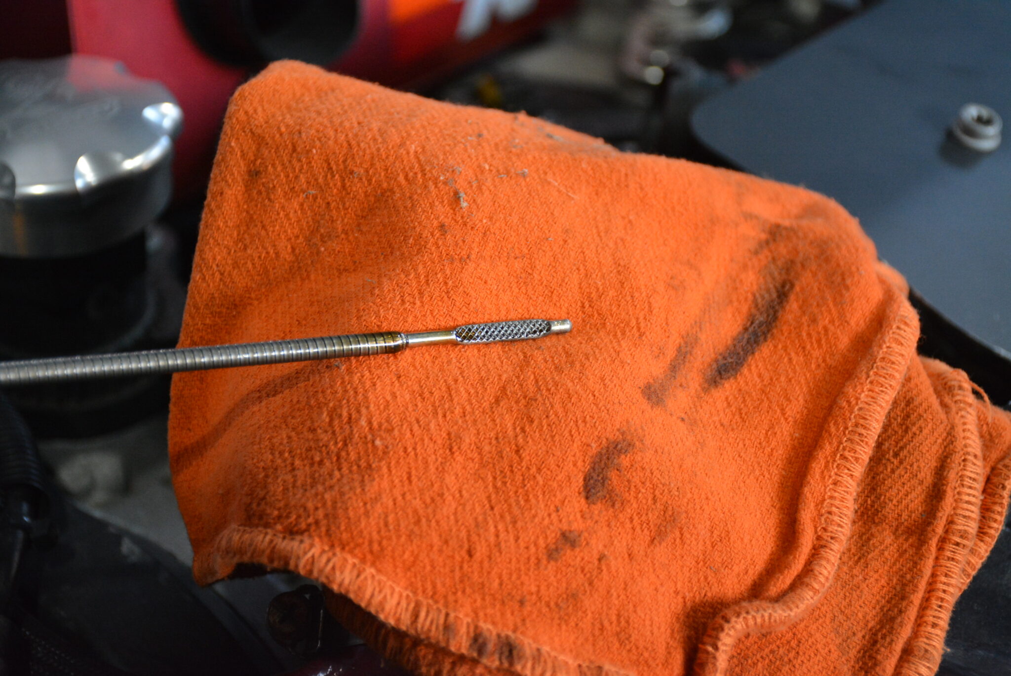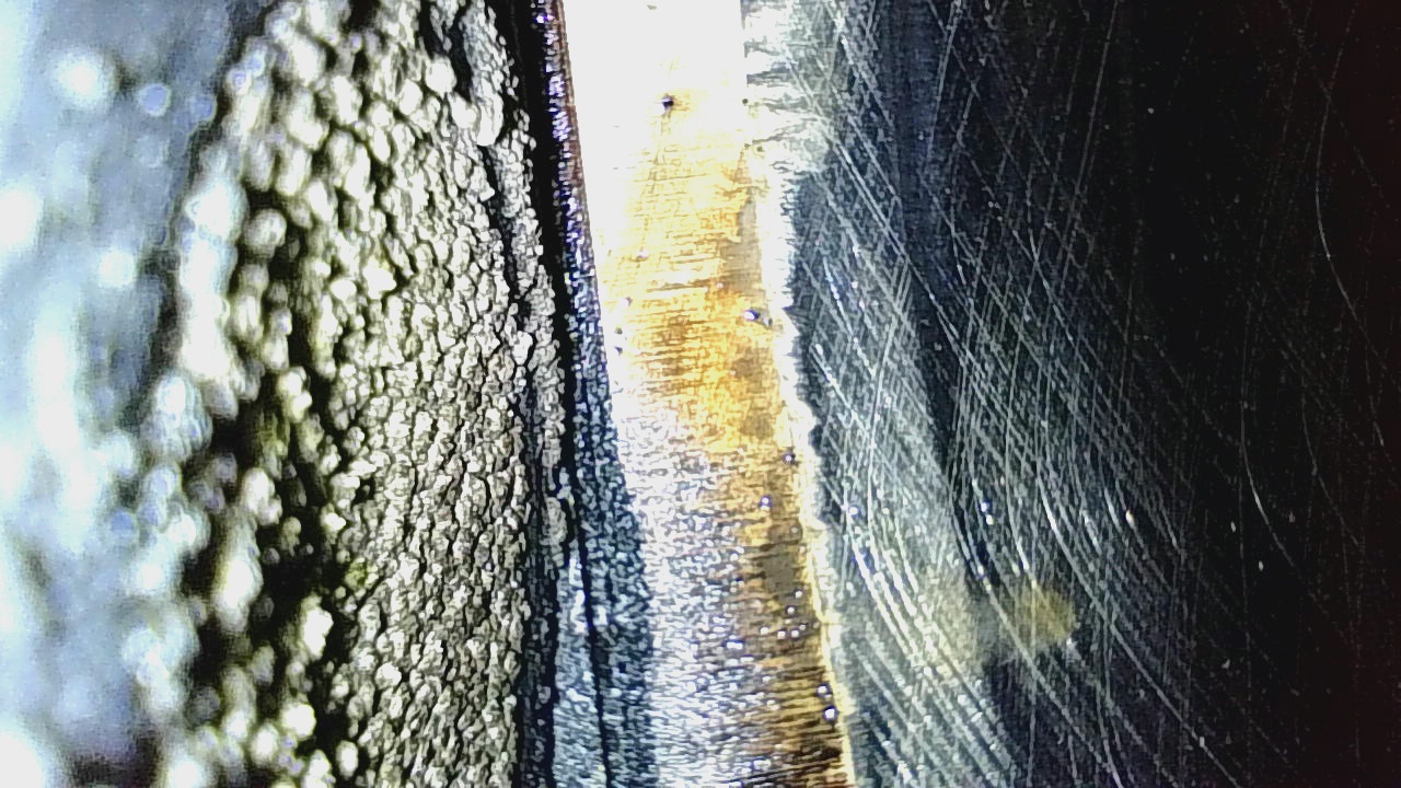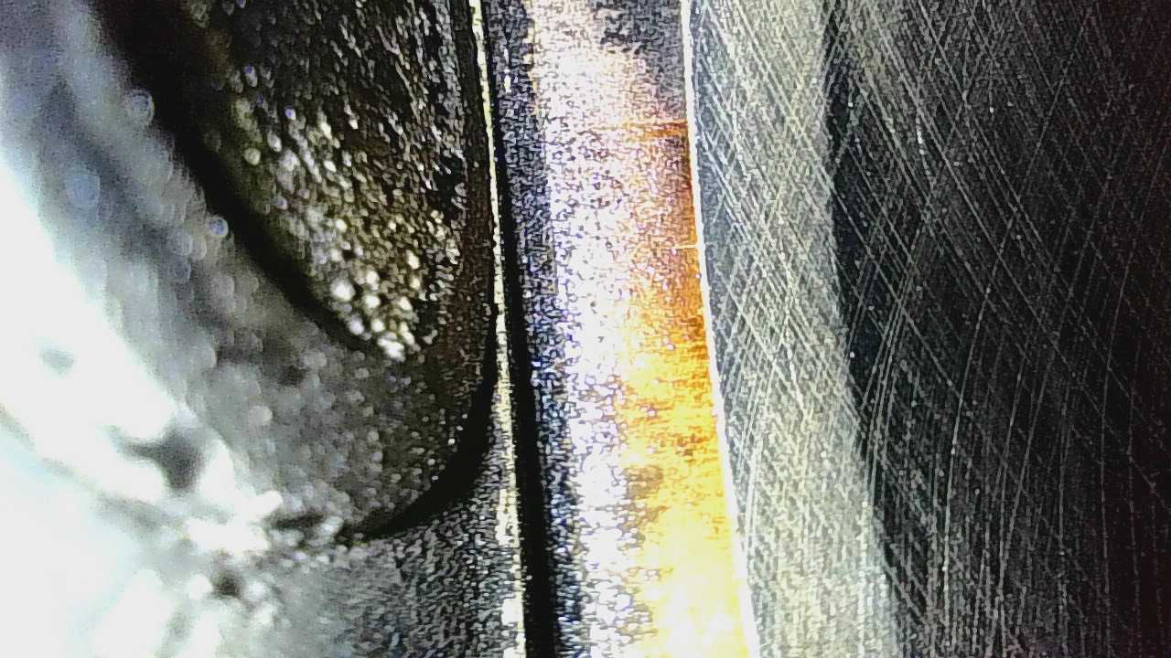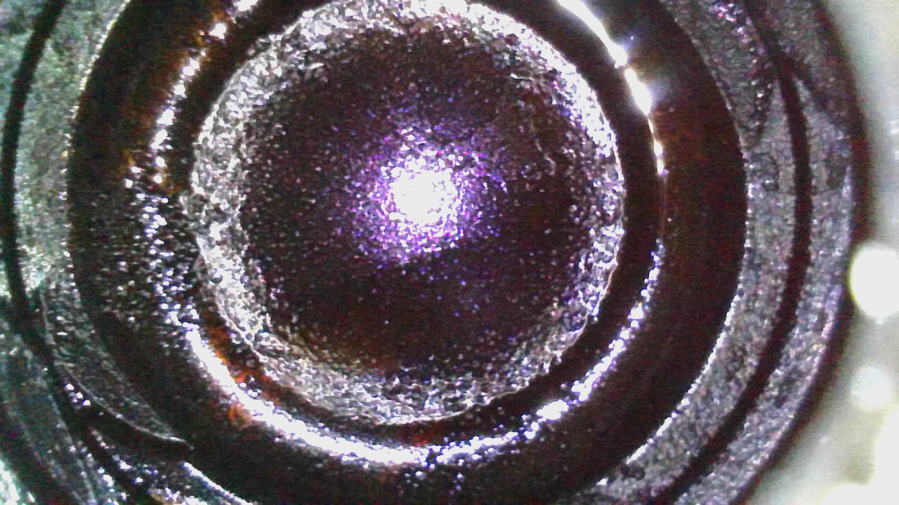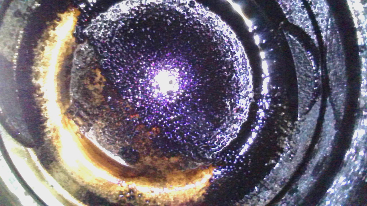 内視鏡をプラグホールから入れ込み、ピストントップを撮影した画像にはキラキラと生々しいオイル溜まりを確認できます。