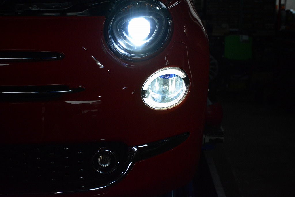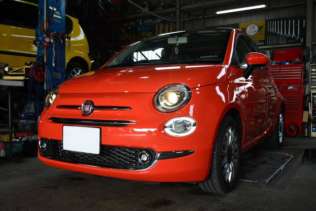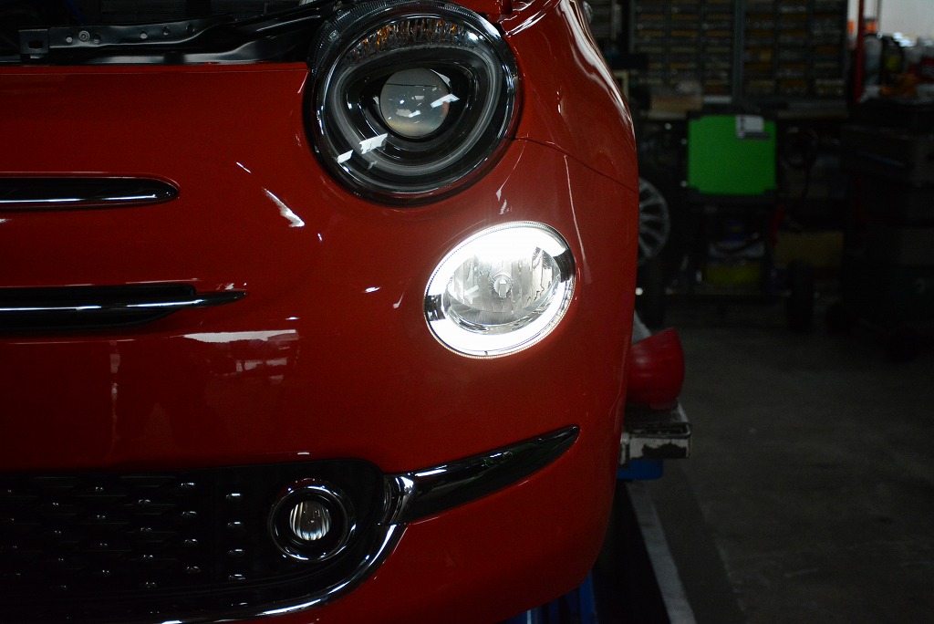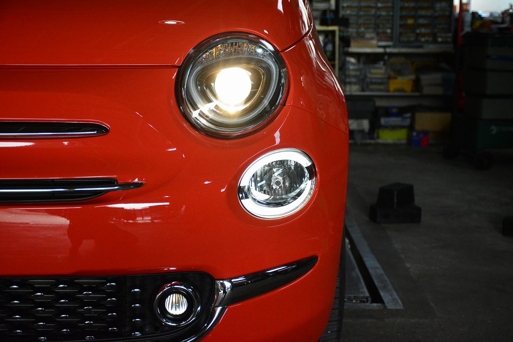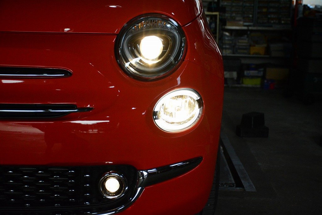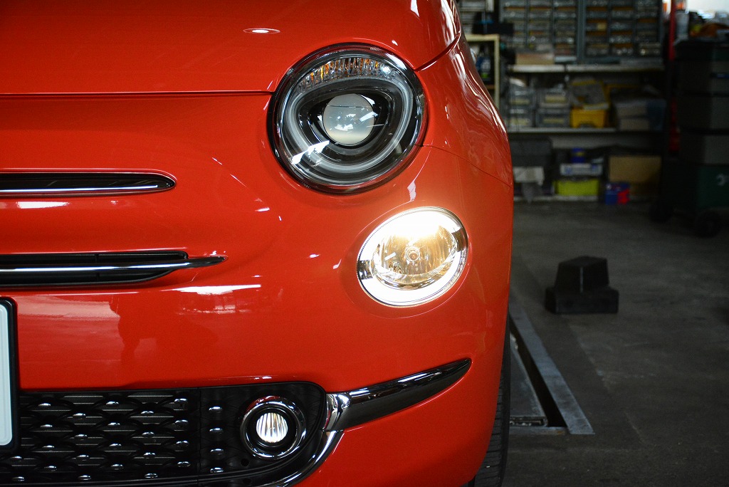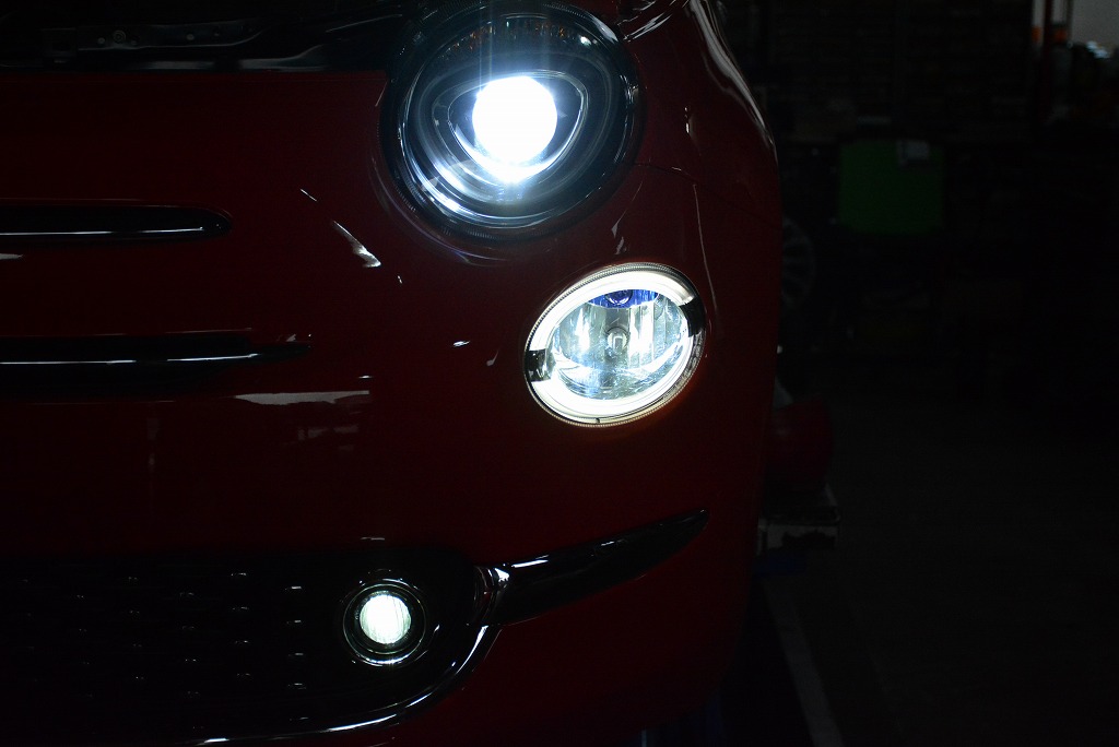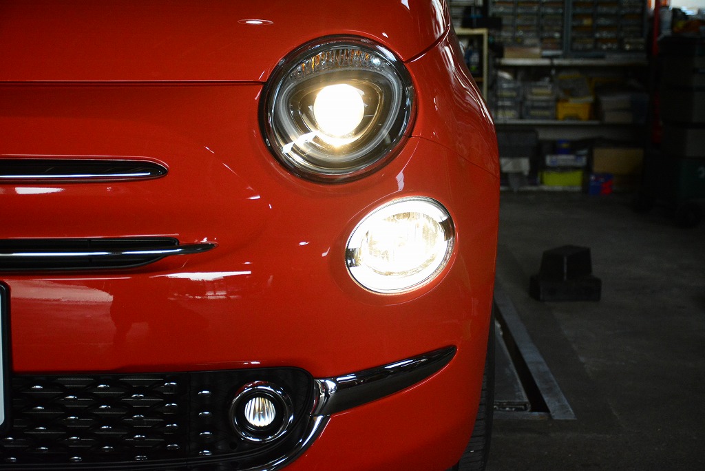 今回の500は、搭載エンジンはツインエアー・ヘッドライトはハロゲン/プロジェクタ・デイライトは2種が発光・ハイビームはH7バルブが装着されています。