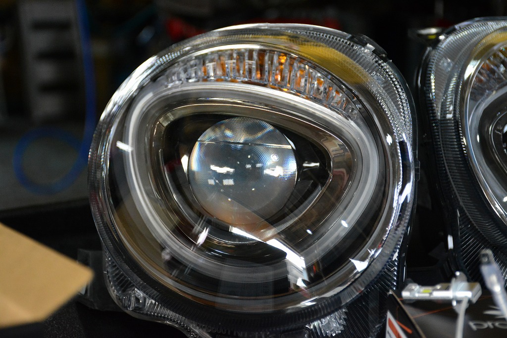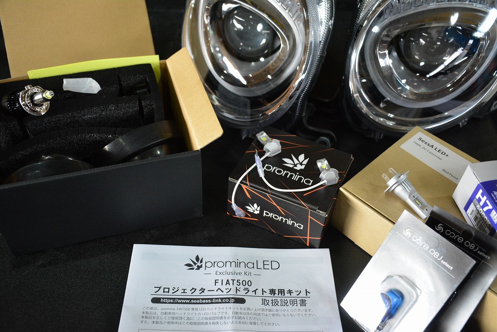 シーバスリンク社がリリースする「promina LED FIAT500 プロジェクターライト専用キット」をメインに使用します。