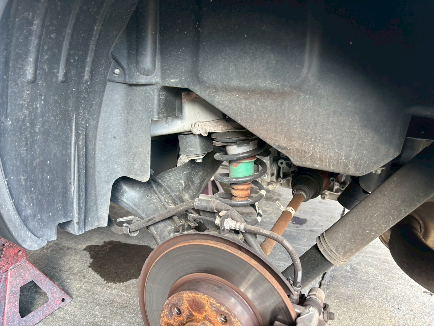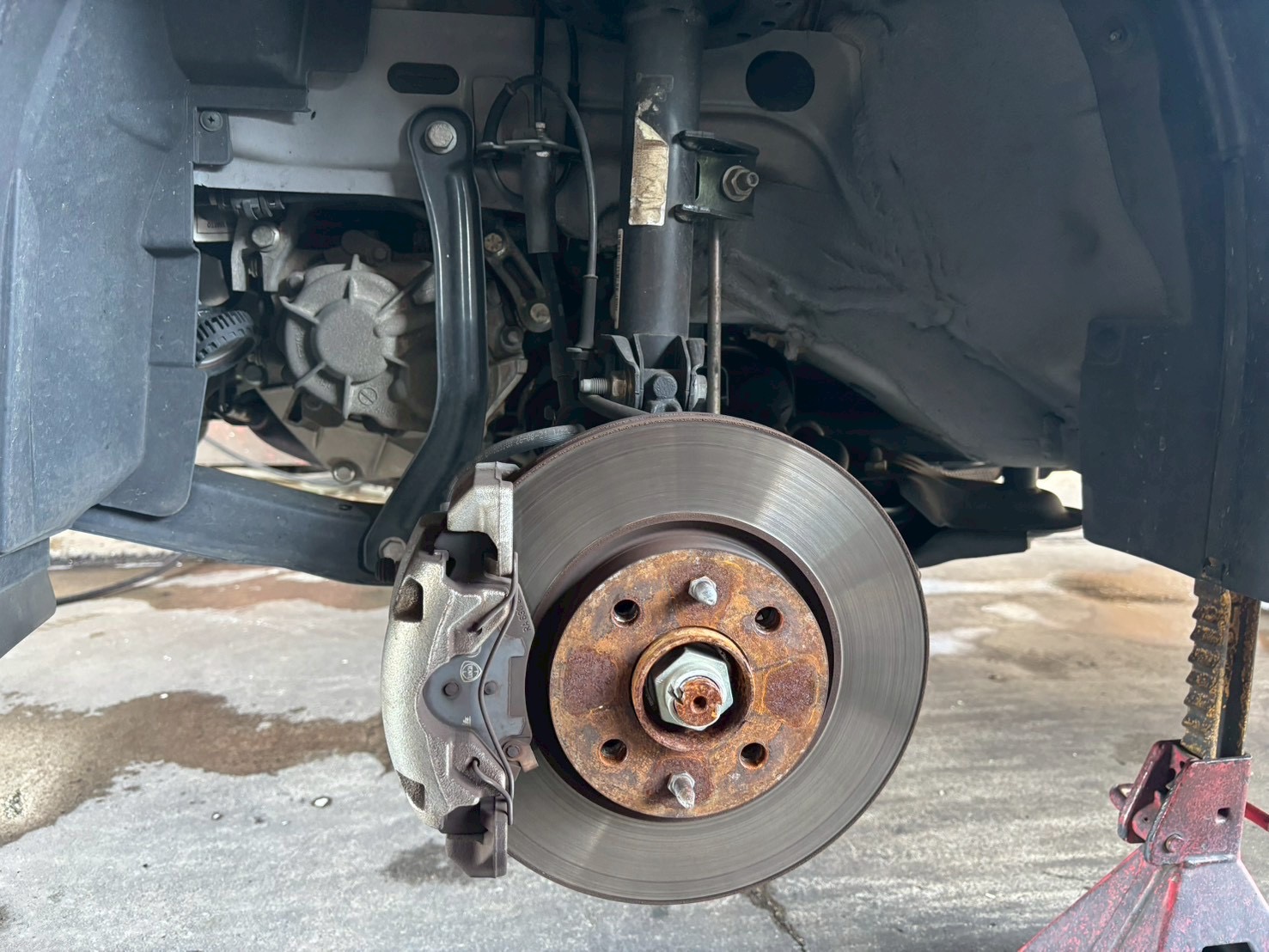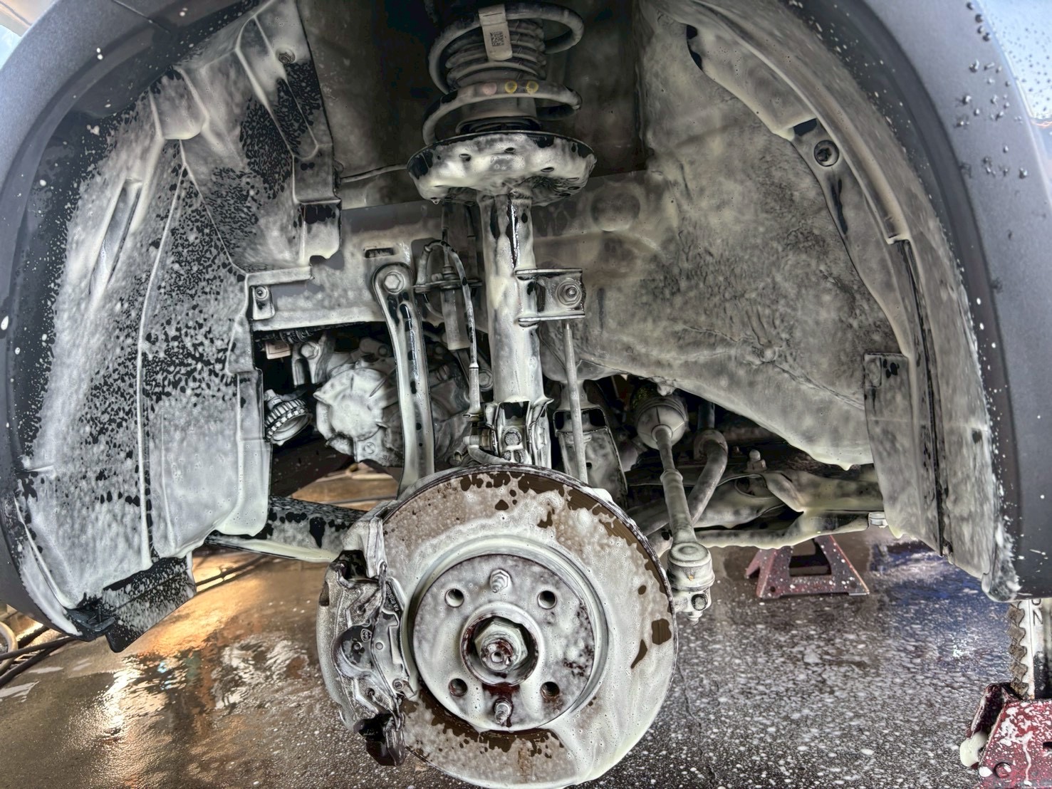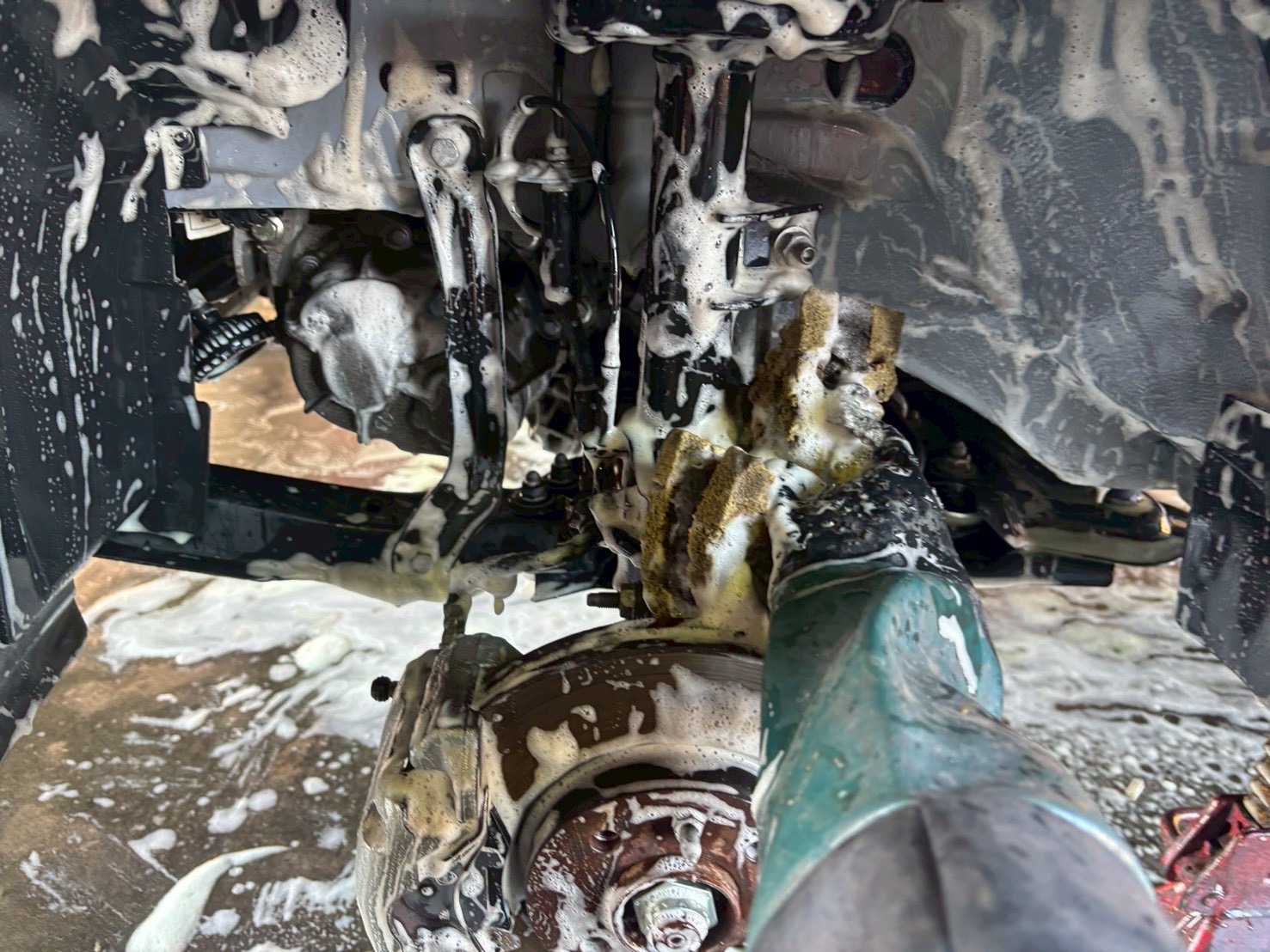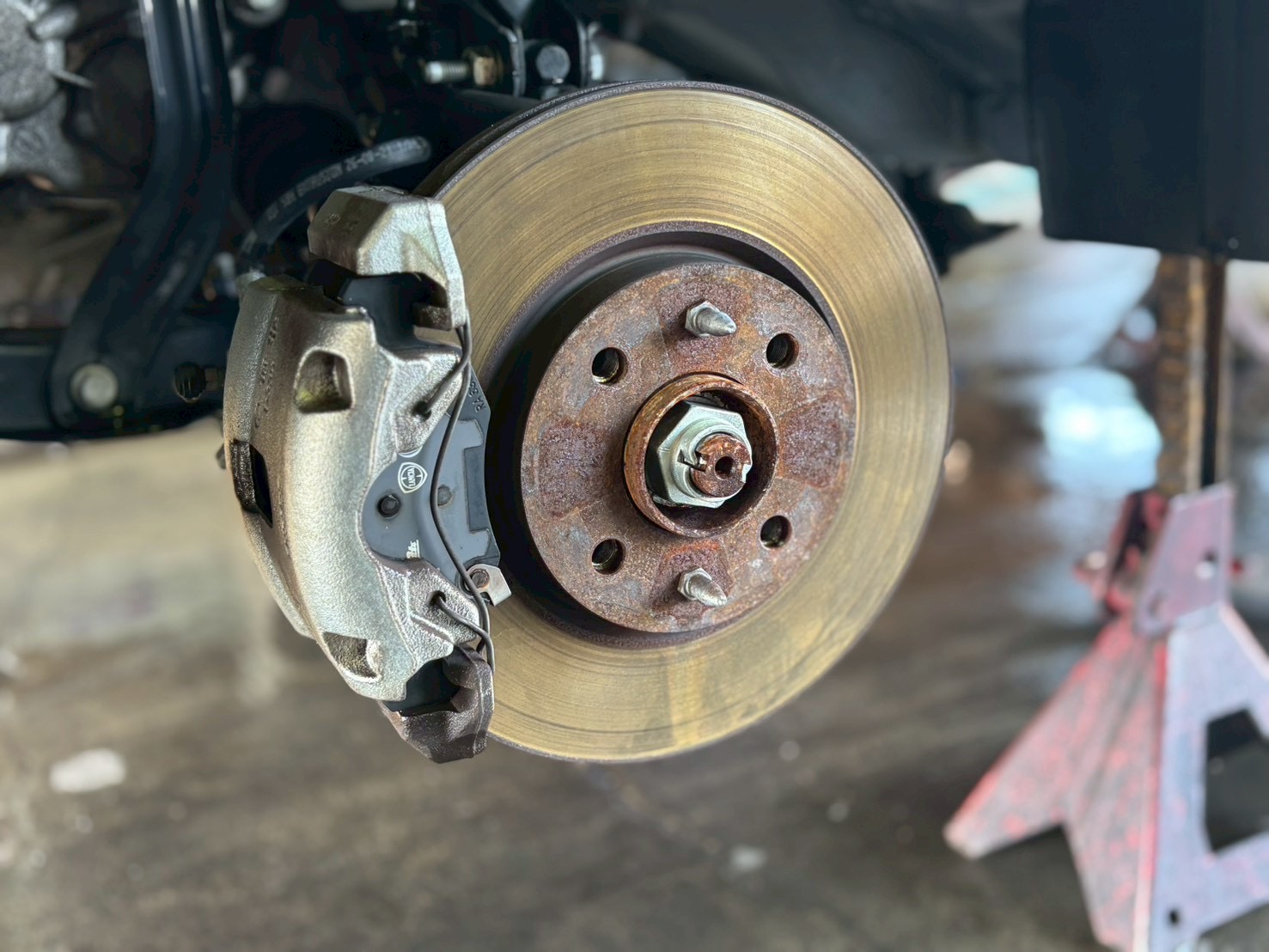 洗浄前のよくある光景として、汚れたタイヤハウス・サスペンションパーツ・そして錆びたブレーキディスクのドライブフランジ、これらを綺麗に仕上げます。