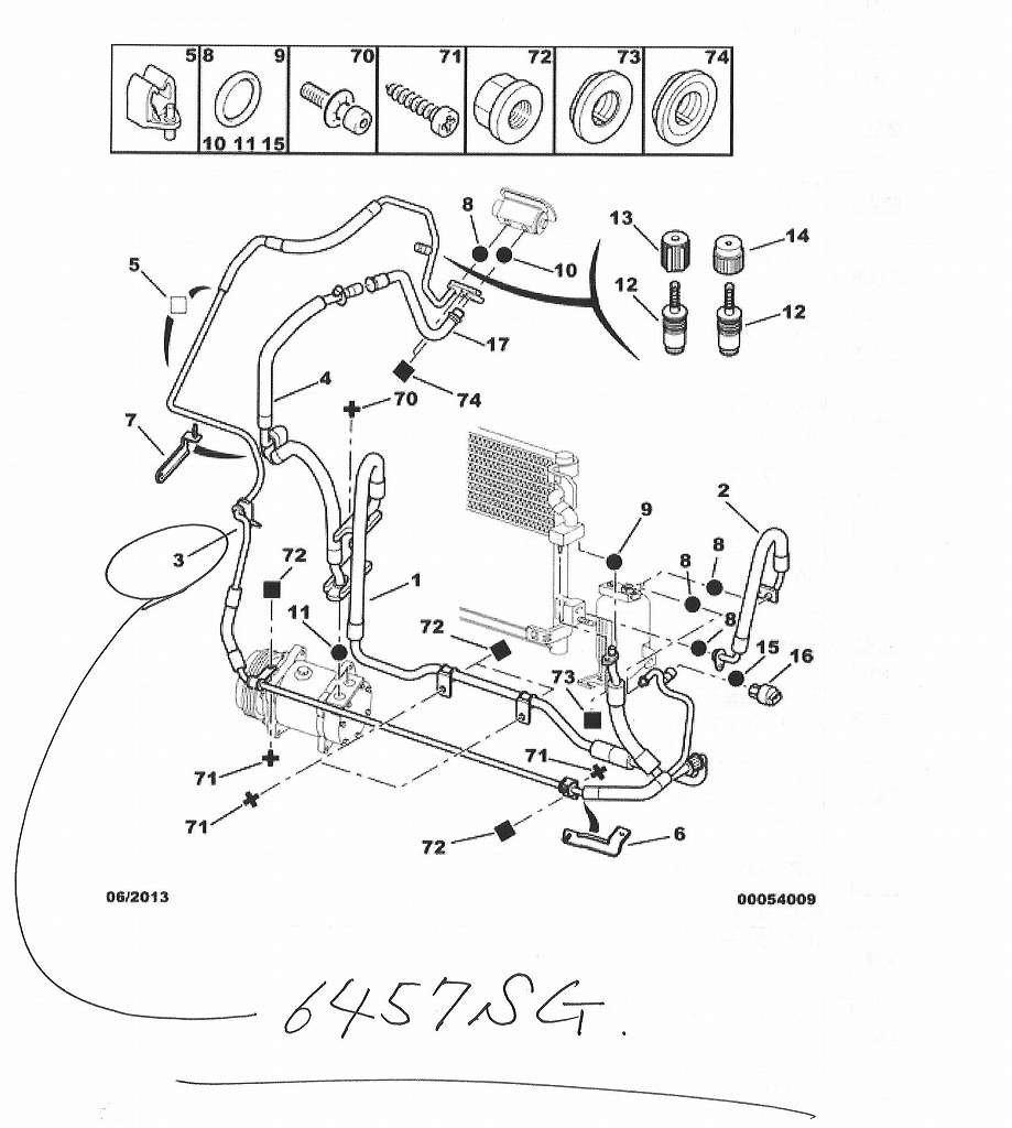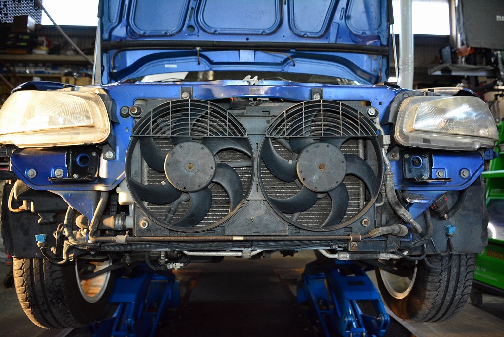 エキパン~ECU下を通り、コアサポートを抜けクーリングファンの前を通過~その後に直角で立ち上がり狭小スペースのレシーバへと接続。