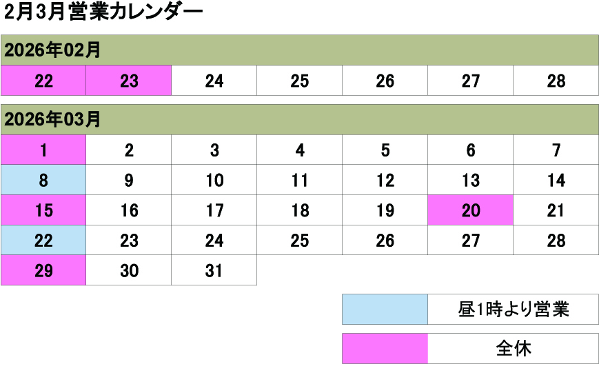 2月3月の営業カレンダー