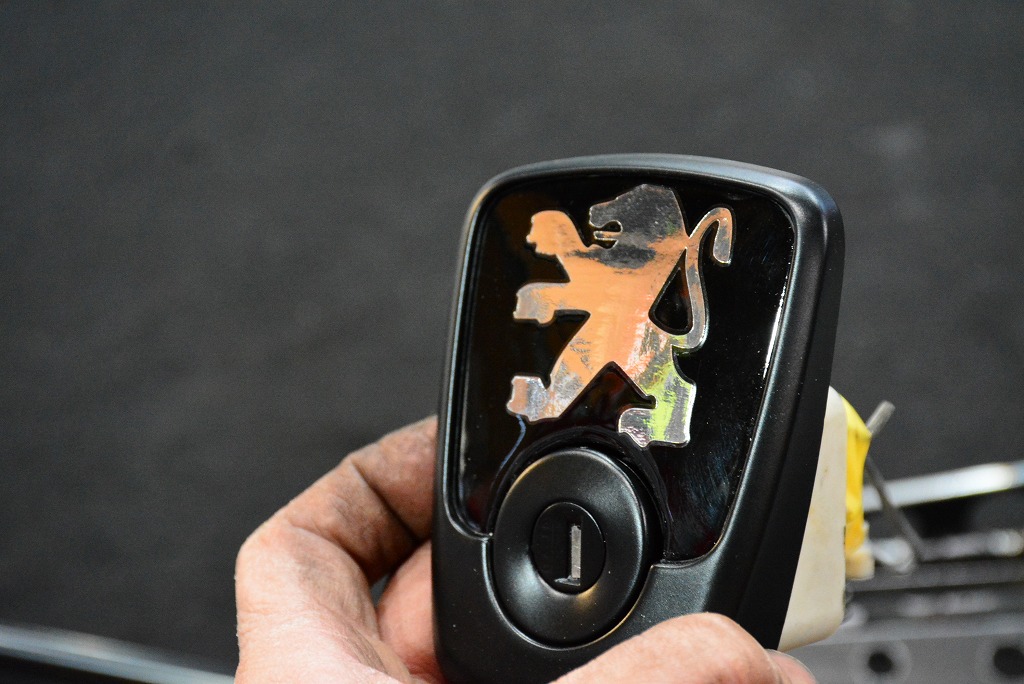 プジョー106のリヤハッチオープナー。 ライオンマークが特徴的な機能部品の一つです。 この場所から、ライオンが逃げてしまう事が多々あり、そうなるとなんとも寂しい印象となります。 理由は経...