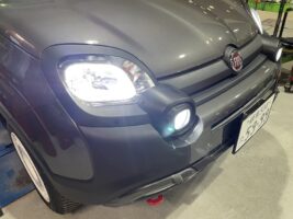 様々な作業が大詰めのPANDA CROSSはヘッドライトとフォグランプバルブをLEDに変更を行います。CROSSののフォグランプはバンパー中央より中段にレイアウトの為、タイヤハウスインナーライナー側よ...