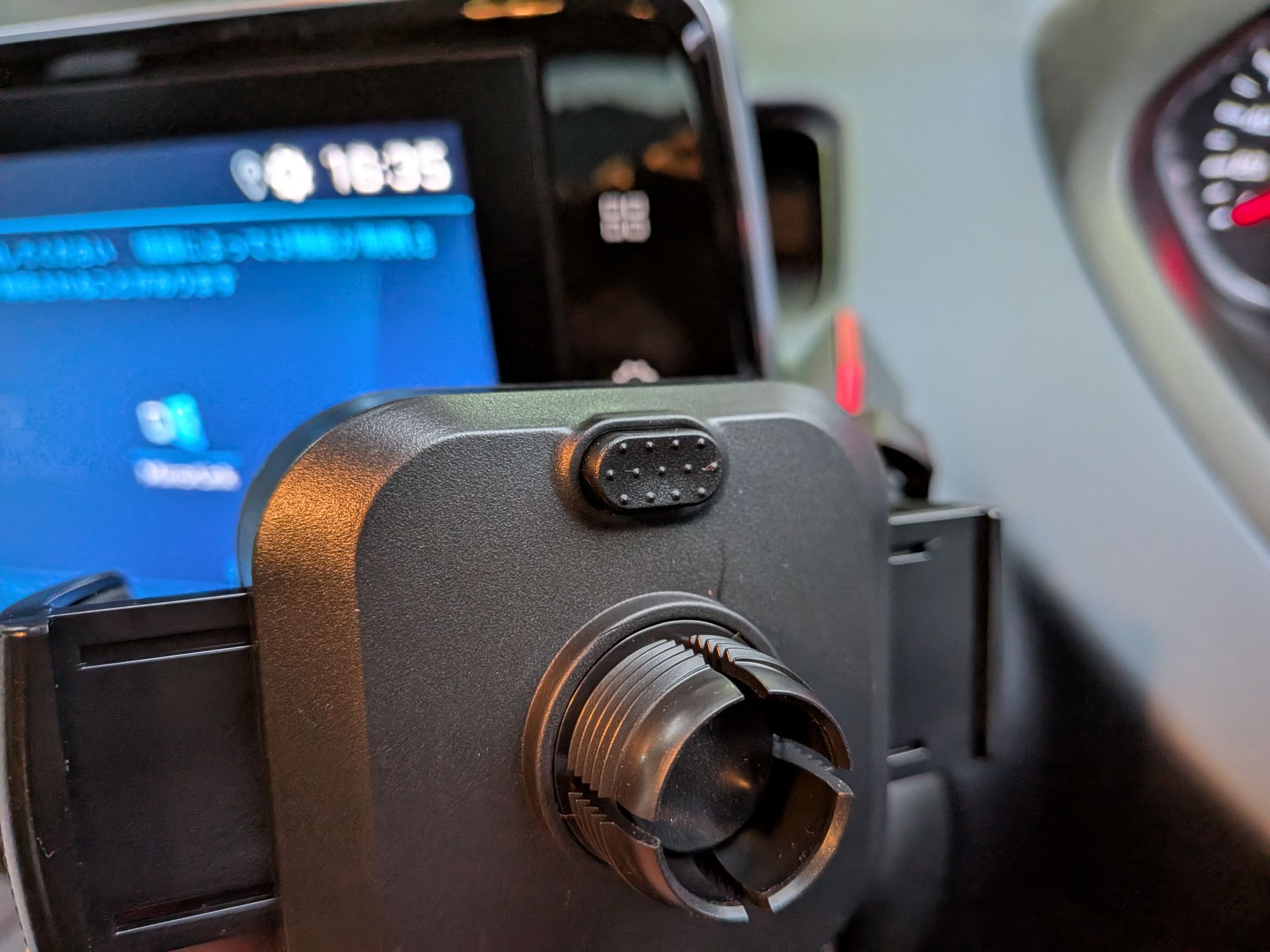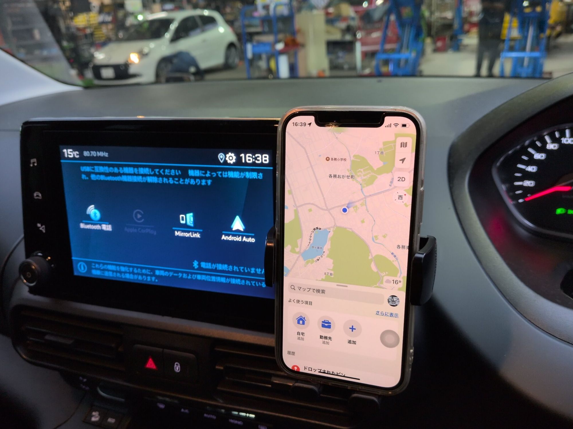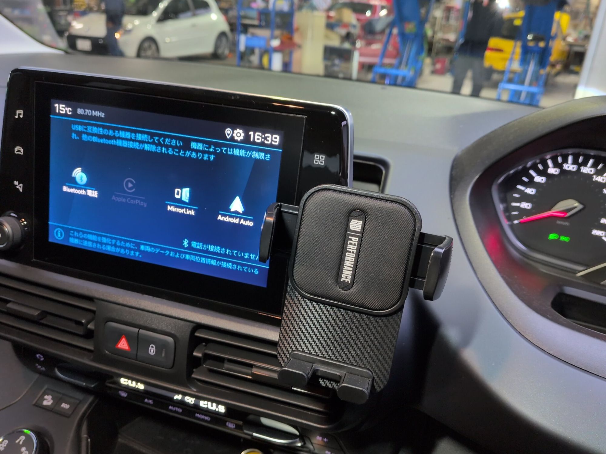 ステアリング近くにスマートフォンの固定が出来、車両モニターのUSBソケットにも近く使い勝手は良さそうです。
